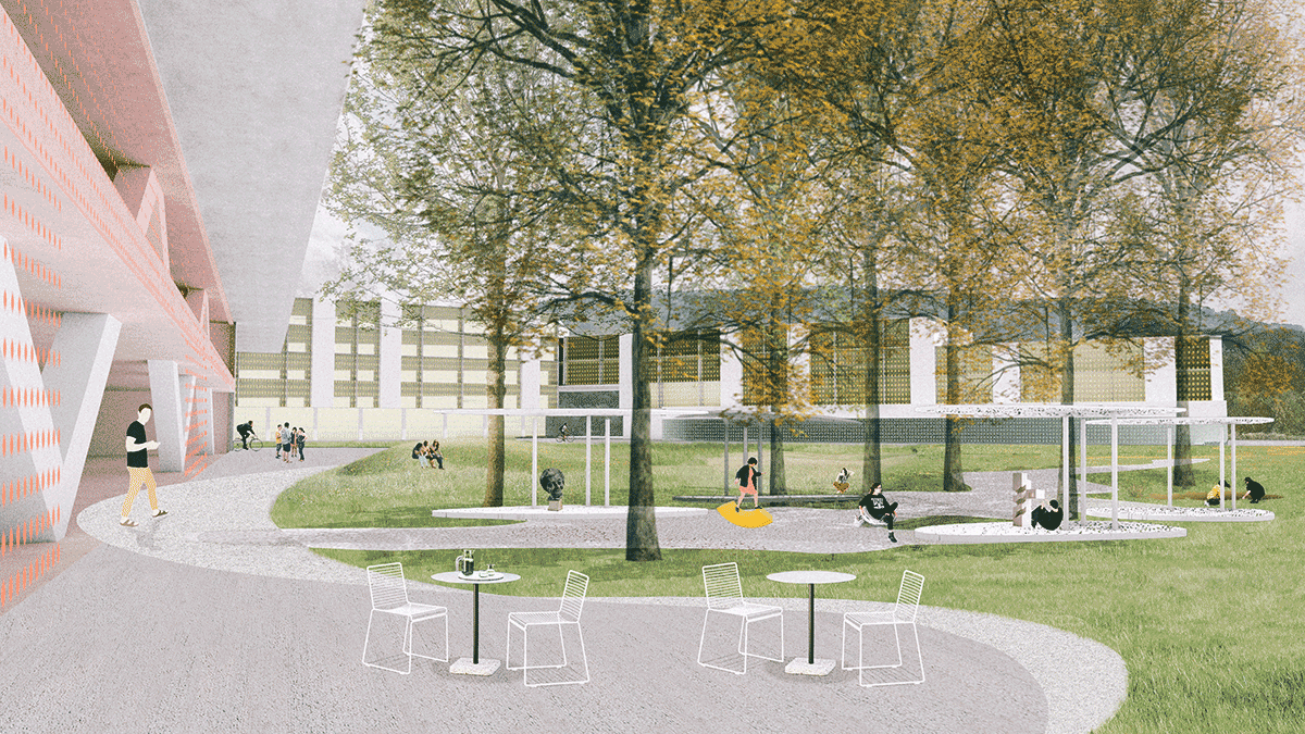 The existing city block is fragmented, the area seems as its development remained stuck somewhere in time, so new interventions are necessary to avoid further degeneration of the place. The new urban design establishes a dialogue with the existing and continues the indicated shape of city blocks with new volumes. The buildings of the Academy of Fine Arts and Design and the Secondary School of Design and Photography conclude a street tissue, creating an important spatial quality on the site of degraded green areas – a new green city square. This is a move that, alongside a hybrid design approach, forms a hybrid of meadow, landscape, and the classic square. It is a necessary city-creating intervention as it not only opens the space but also brings the potentials of an open urban gallery.